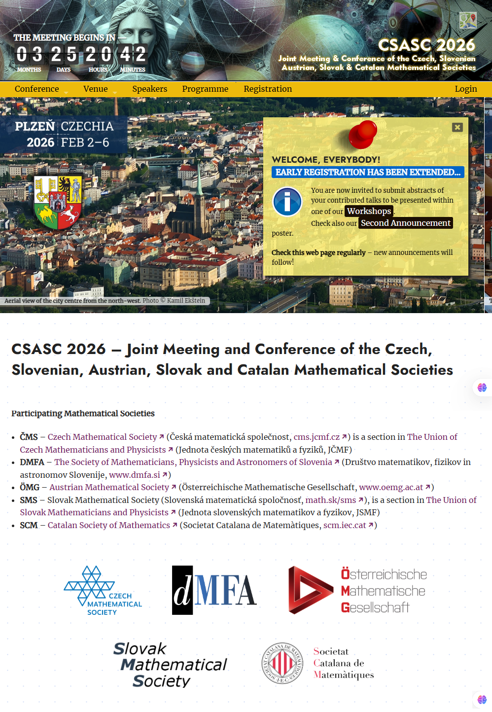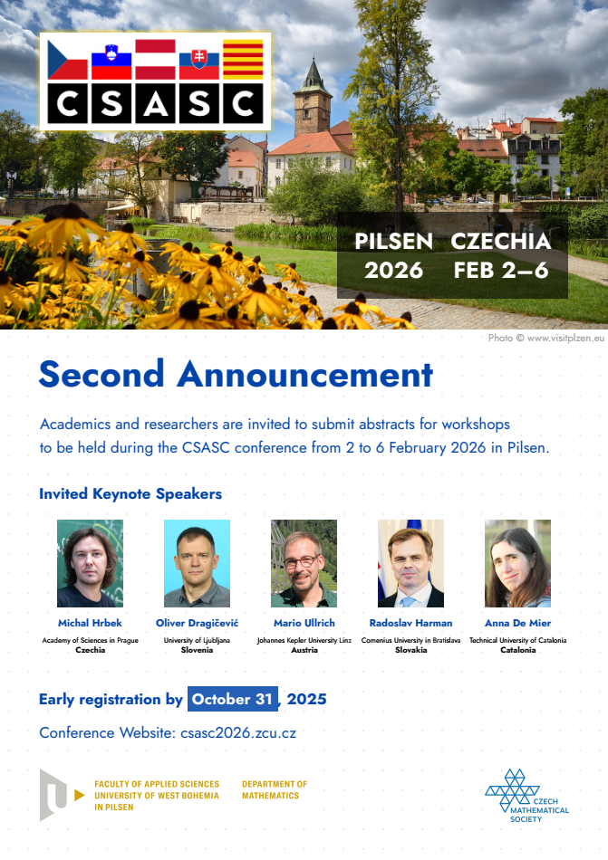 Člani DMFA Slovenije, raziskovalci iz področja matematike, ste toplo vabljeni k aktivni udeležbi na konferenci CSASC 2026, ki jo skupaj organizirajo matematična društva Češke, Slovaške, Avstrije, Slovenije in Katalonije. Konferenca bo od 2. do 6. februarja 2026 v češkem mestu Plzen, obeta se 5 zanimivih vabljenih predavanj in 13 specializiranih delavnic z različnih področij matematike. Rok za prijavo prispevkov je 31. 10. 2025. Več informacij o konferenci najdete na spletni strani https://csasc2026.zcu.cz/ .