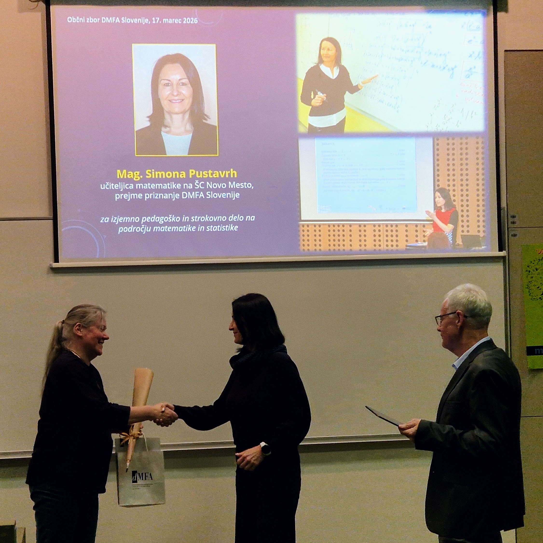 - Mag. Simona Pustavrh, učiteljica matematike na ŠC Novo Mesto, za izjemno pedagoško in strokovno delo na področju matematike in statistike.