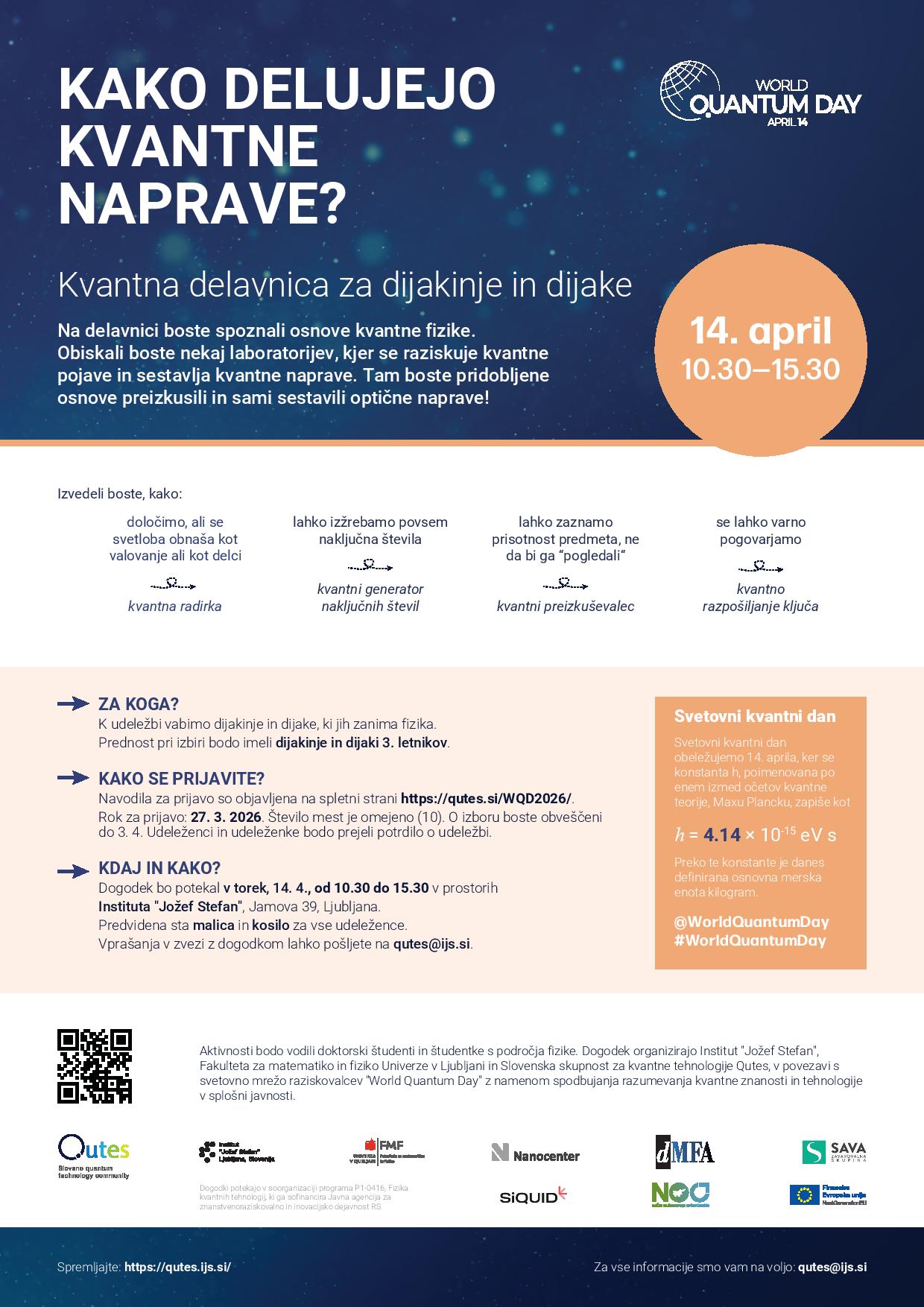 Vabljeni na kvantno delavnico za dijakinje in dijake. Na delavnici boste spoznali osnove kvantne fizike. Obiskali boste nekaj laboratorijev, kjer se raziskuje kvantne pojave in sestavlja kvantne naprave. Tam boste pridobljene osnove preizkusili in sami sestavili optične naprave! K udeležbi vabimo dijakinje in dijake, ki jih zanima fizika. Prednost pri izbiri bodo imeli dijakinje in dijaki 3. letnikov.