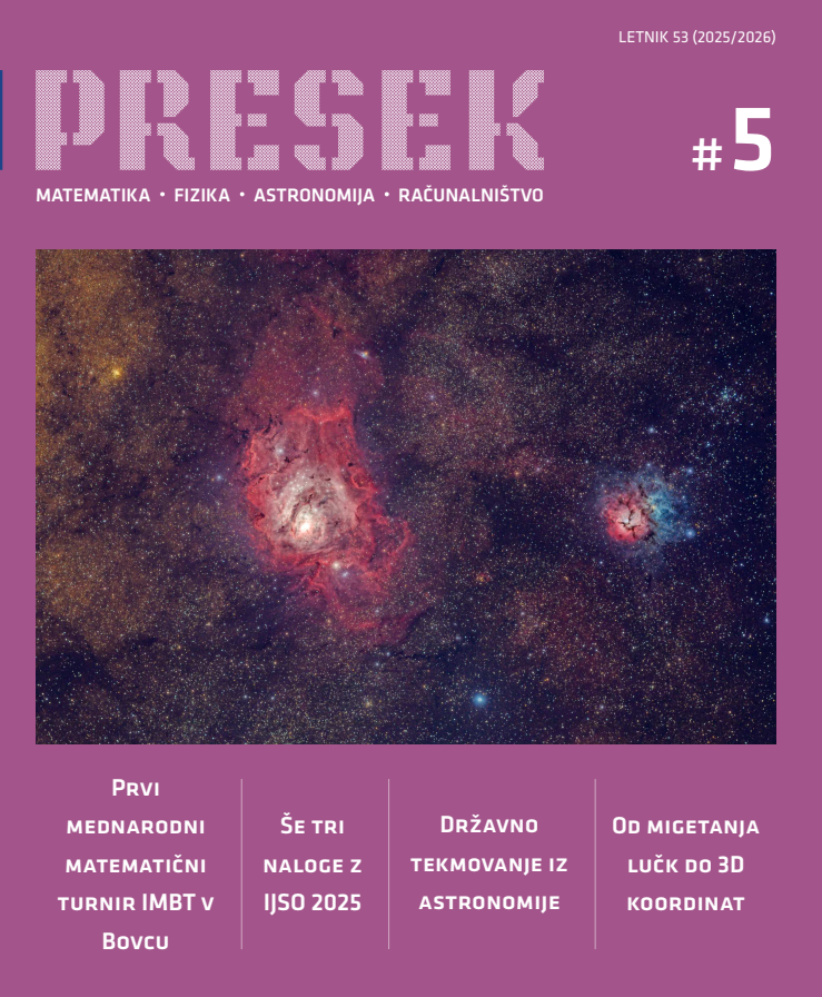 Spoštovani učitelji in učiteljice, dijaki, dijakinje, mladi in starejši ljubitelji znanosti. Tudi v letošnjem šolskem letu pod okriljem DMFA Slovenije poteka Presekov seminar za matematiko, fiziko in astronomijo. Naslednje srečanje bo v sredo, 22. aprila ob 17h. Na seminarju, ki se izvaja na daljavo preko spleta, pretežno obravnavamo matematično-fizikalne teme, povezane s članki iz aktualne številke revije Presek. Seminar vodita doc. dr. Boštjan Kuzman (UL PEF) in doc. dr. Aleš Mohorič (UL FMF), kot občasni predavatelji pa sodelujejo še avtorji člankov in drugi priložnostni gostje.